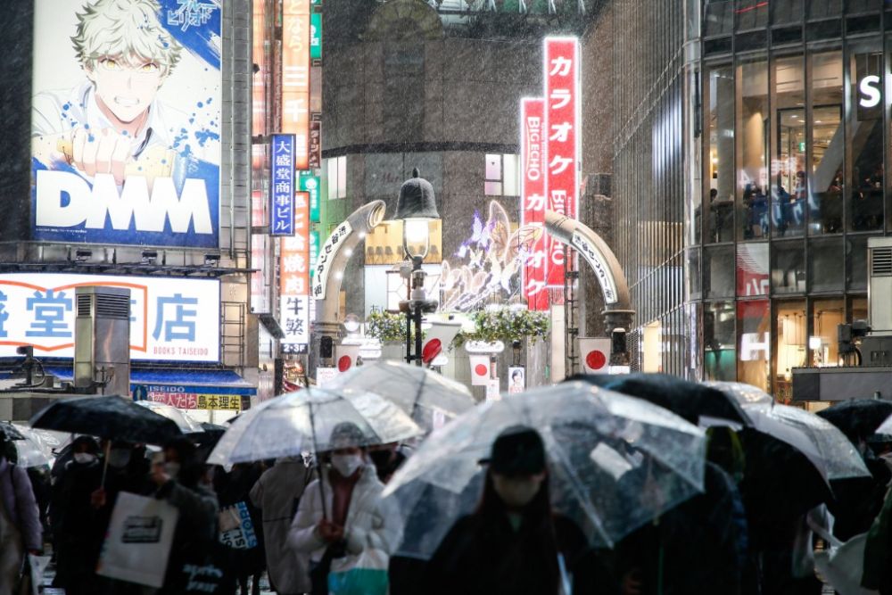 1月6日,人们冒雪走在日本东京涩谷街头。(新华社记者张笑宇摄)