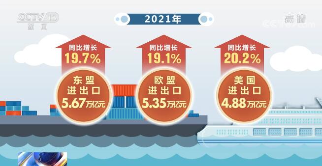 海关统计显示,2021年,我国对东盟、欧盟、美国等主要贸易伙伴进出口分别为5.67万亿元、5.35万亿元和4.88万亿元,同比分别增长19.7%、19.1%和20.2%。