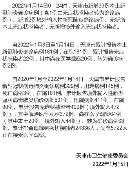 据天津市卫生健康委员会微博,1月14日,天津新增39例本土新冠肺炎确诊病例。