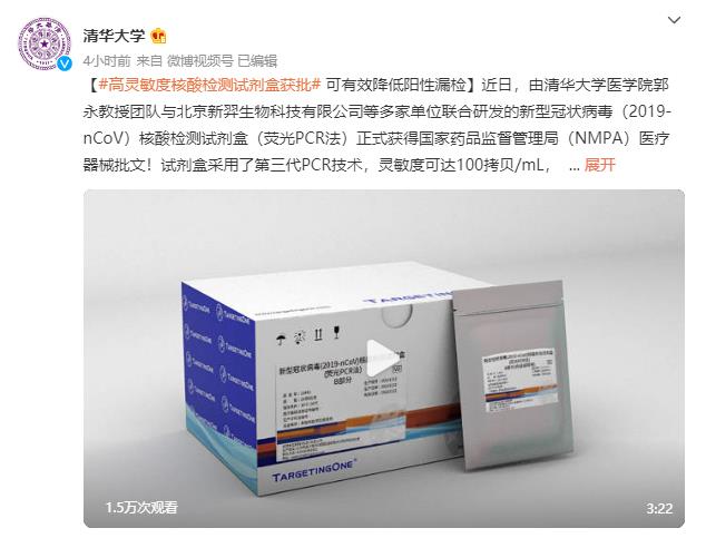 据清华大学官微1月15日消息,近日,由清华大学医学院郭永教授团队与北京新羿生物科技有限公司等多家单位联合研发的新型冠状病毒(2019-nCoV)核酸检测试剂盒(荧光PCR法)正式获得国家药品监督管理局(NMPA)医疗器械批文。
