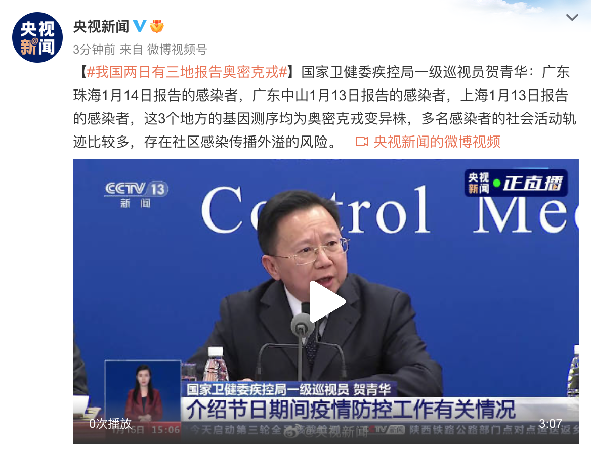 国家卫健委疾控局一级巡视员贺青华:广东珠海1月14日报告的感染者,广东中山1月13日报告的感染者,上海1月13日报告的感染者,这3个地方的基因测序均为奥密克戎变异株,多名感染者的社会活动轨迹比较多,存在社区感染传播外溢的风险。