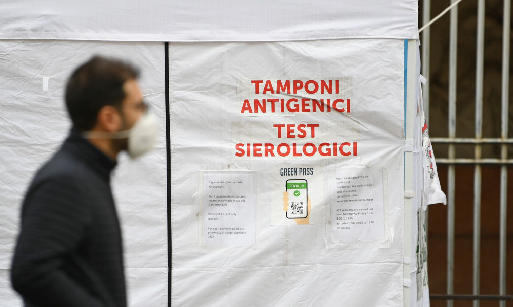 ↑2021年11月11日,一名男子走过罗马一处新冠病毒快速检测点。