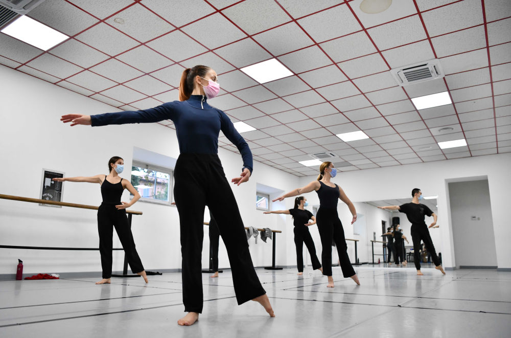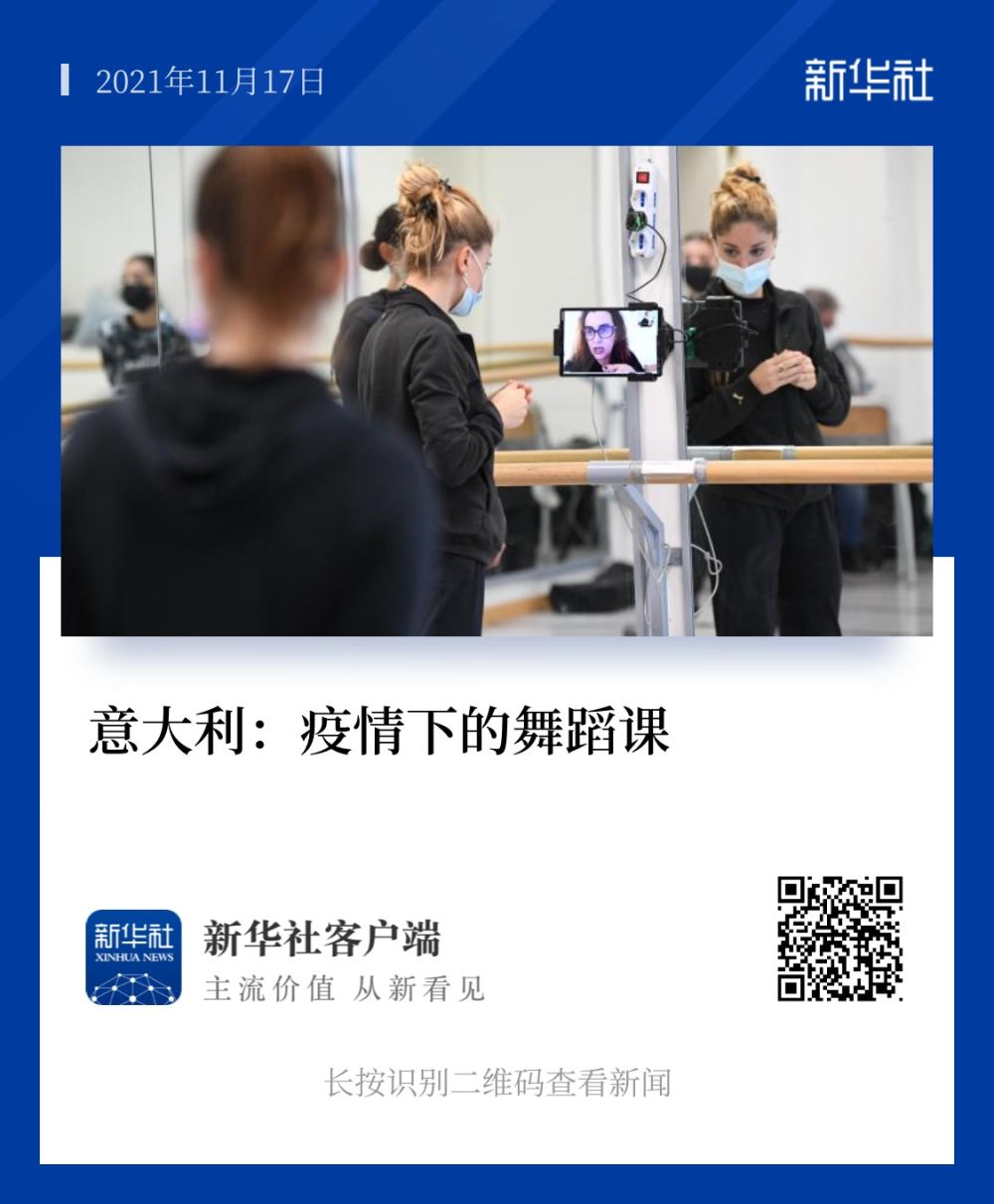 ↑2021年11月16日,学生佩戴口罩在意大利罗马国家舞蹈学院参加现代舞课程。意大利罗马国家舞蹈学院新学年课程通过线上线下相结合的方式开展。学生参加线下课时必须遵守佩戴口罩、保持社交距离等防疫规定,而因疫情不能到场的教师和学生可通过网络形式参与。