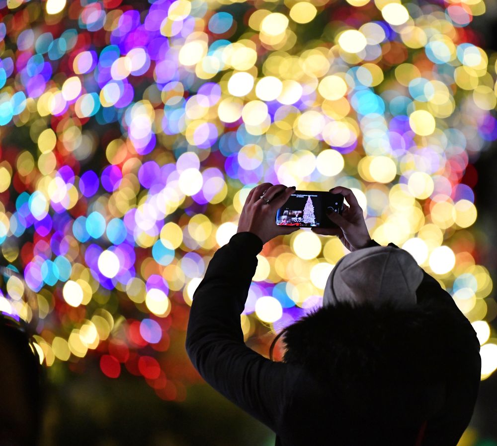 ↑2021年12月11日,一名女子在意大利罗马威尼斯广场上拍摄圣诞树。