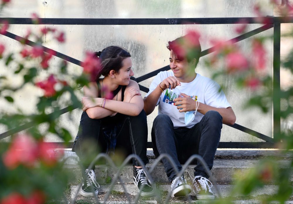 ↑2021年6月28日,在意大利罗马,两名年轻人坐在街边小憩。意大利当日首次实现全国范围全部划定为新冠疫情低风险地区,民众在户外可以不戴口罩。