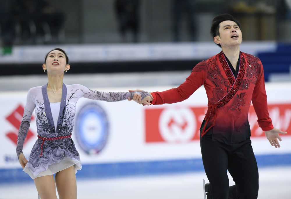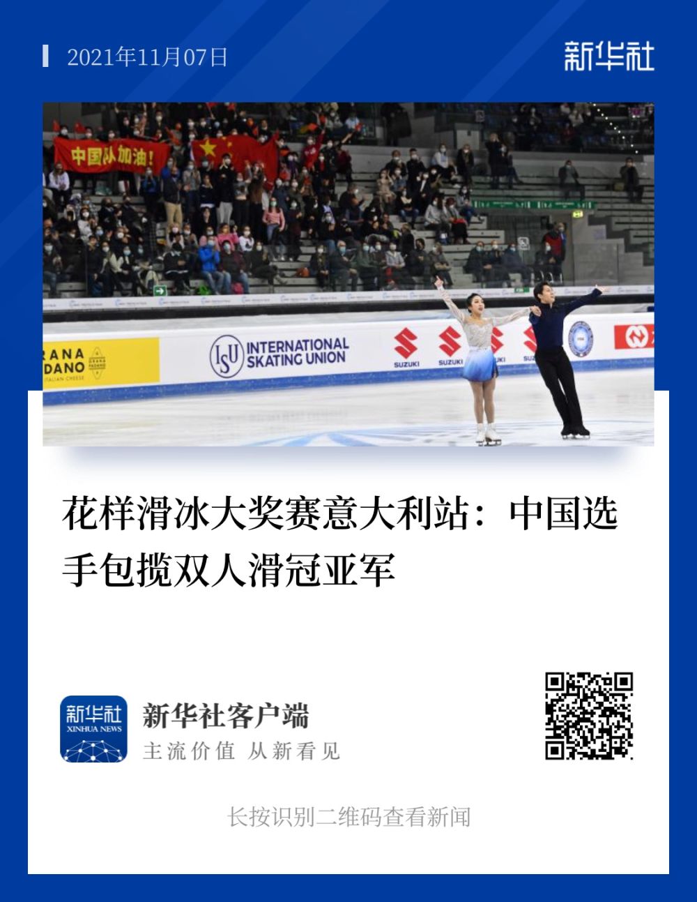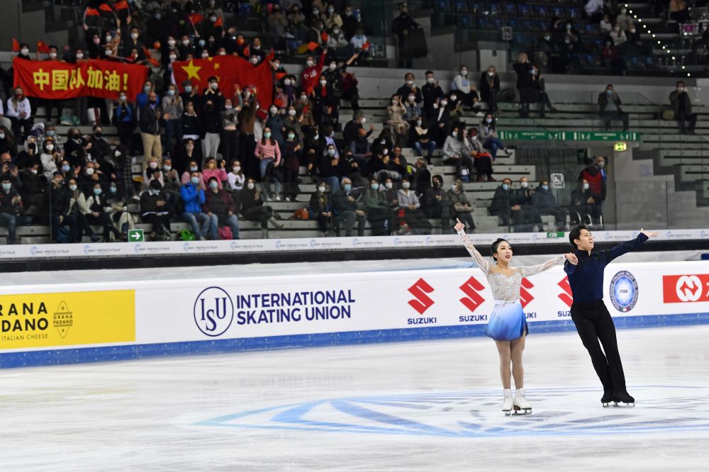 ↑2021年11月6日,隋文静(左)/韩聪在比赛结束后向人们致意。当日,在意大利都灵举行的2021-2022赛季花样滑冰大奖赛意大利站双人滑比赛中,中国选手隋文静/韩聪以224.55分的总成绩夺得冠军。