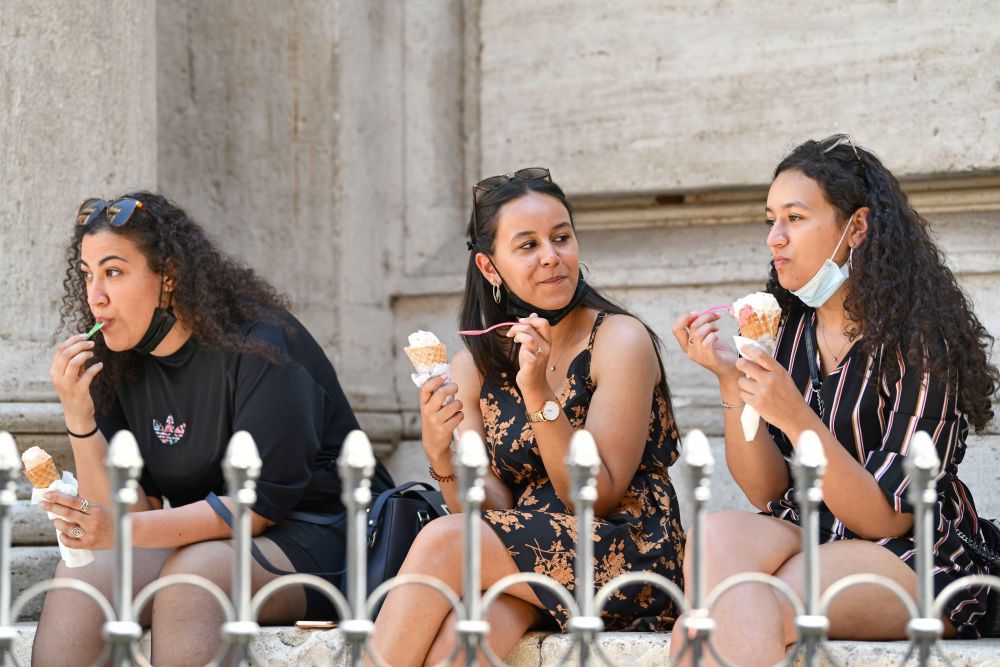 ↑2021年7月11日,在罗马吃冰淇淋消暑的三个女人。