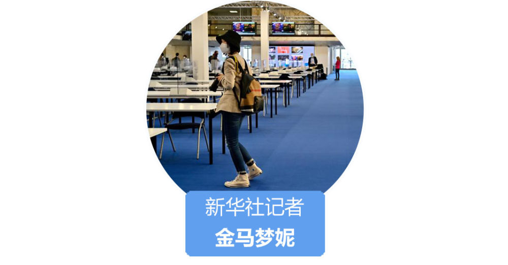 ↑2021年10月28日,新华社记者金马梦妮在G20罗马峰会的媒体中心采访。