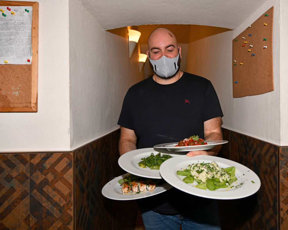 ↑2021年6月24日,西莫内在罗马的“La Gensola”餐馆内准备为客人上菜。西莫内说,疫情期间“La Gensola”餐馆根据防疫政策几度关门谢客,西莫内希望餐馆能在未来经受住考验。