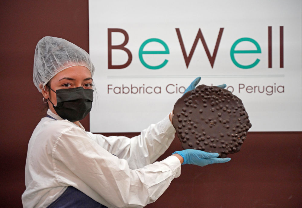 ↑2021年10月15日,一名女子在佩鲁贾“欧洲巧克力节”上展示一块巧克力。
