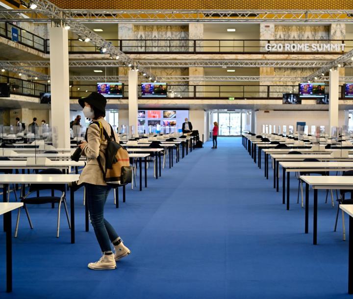 ↑2021年10月28日,在意大利罗马,人们在二十国集团领导人峰会媒体中心内忙碌。