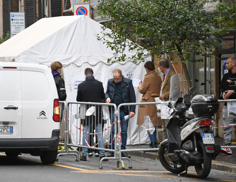 ↑2021年11月11日,人们在罗马一处新冠病毒快速检测点外等待。