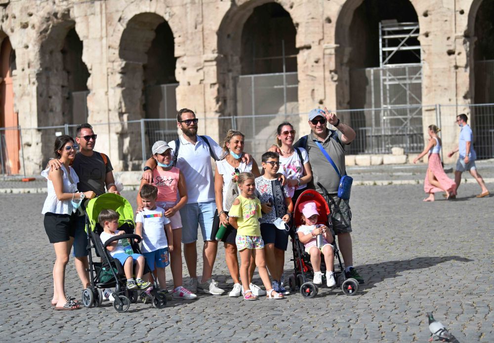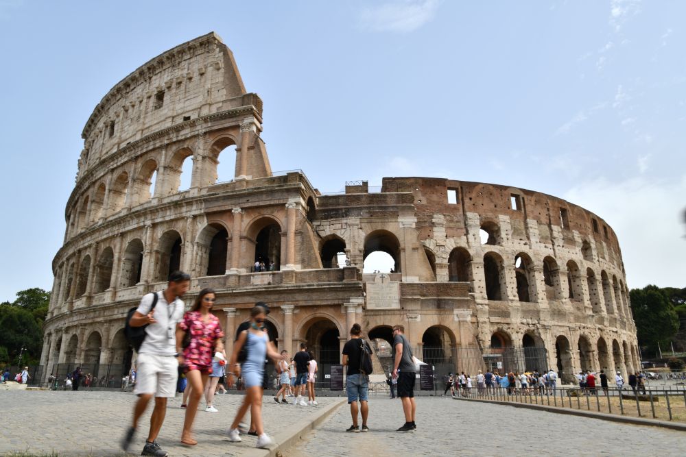 ↑2021年8月4日,游客聚集在罗马斗兽场前。每年八月是意大利的“国民假期”,当地人在此期间享有长短不等的放假时光。