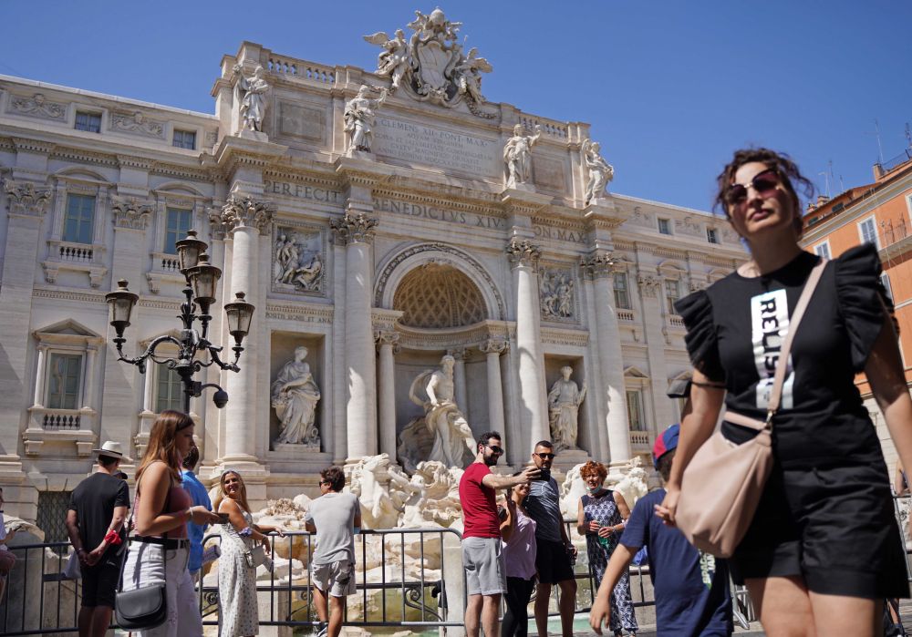 ↑2021年7月11日,人们在罗马的许愿池前游览。