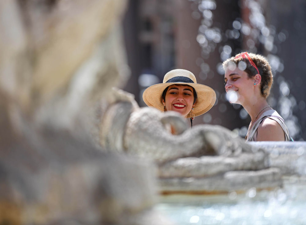 ↑2021年8月12日,两名游客在意大利罗马的一处喷泉旁纳凉。