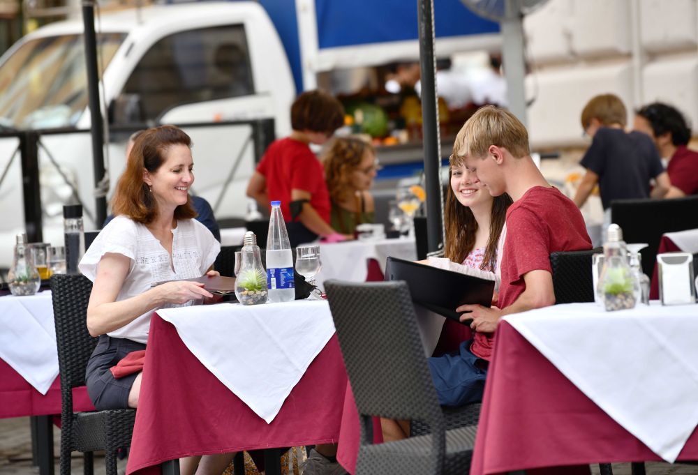↑2021年6月24日,人们在意大利罗马一家餐馆的户外区域消费。