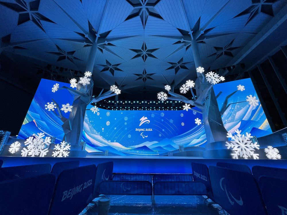延庆冬残奥颁奖广场建基于北京世园公园国际馆,总体占地面积12000平方米,实际使用面积约17000平方米,是唯一只承担冬残奥任务的非竞赛场馆。依照“简约、安全、精彩”的办赛要求,延庆颁奖广场在现有建筑的基础上增设集装箱、篷房、板房、转播平台等多种不同形式的临时性设施。作为室内永久性建筑与少量临建相结合的场馆,延庆冬残奥颁奖广场临时设施由北控集团总承包建设,去年10月20日开工,历时2个多月建成。