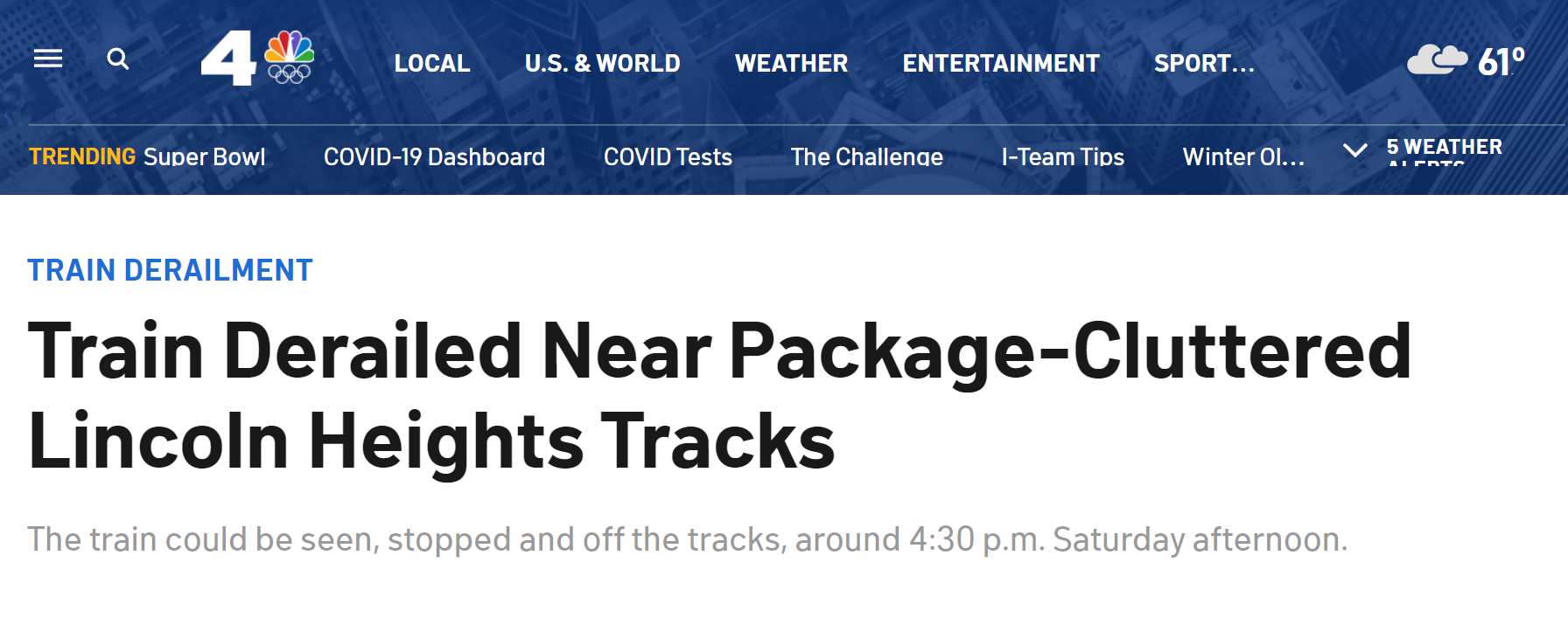 NBC称,当地时间15日16时30左右林肯高地事发现场的画面显示,一辆火车因脱轨停在铁路附近,车厢横七竖八地排列着;列车旁轨道上还散落不少垃圾。
