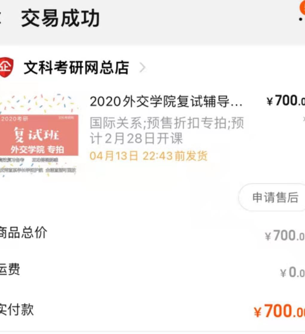 张铭介绍,考研过了初试后,他于2020年年初开始准备复试内容。因此前看过许多文考网的广告,也加过相关人员的微信咨询,“考我报的这个学校,考生几乎都知道文考网。”于是,他在当年2月购买了价值700元的“国际关系复试班”课程。