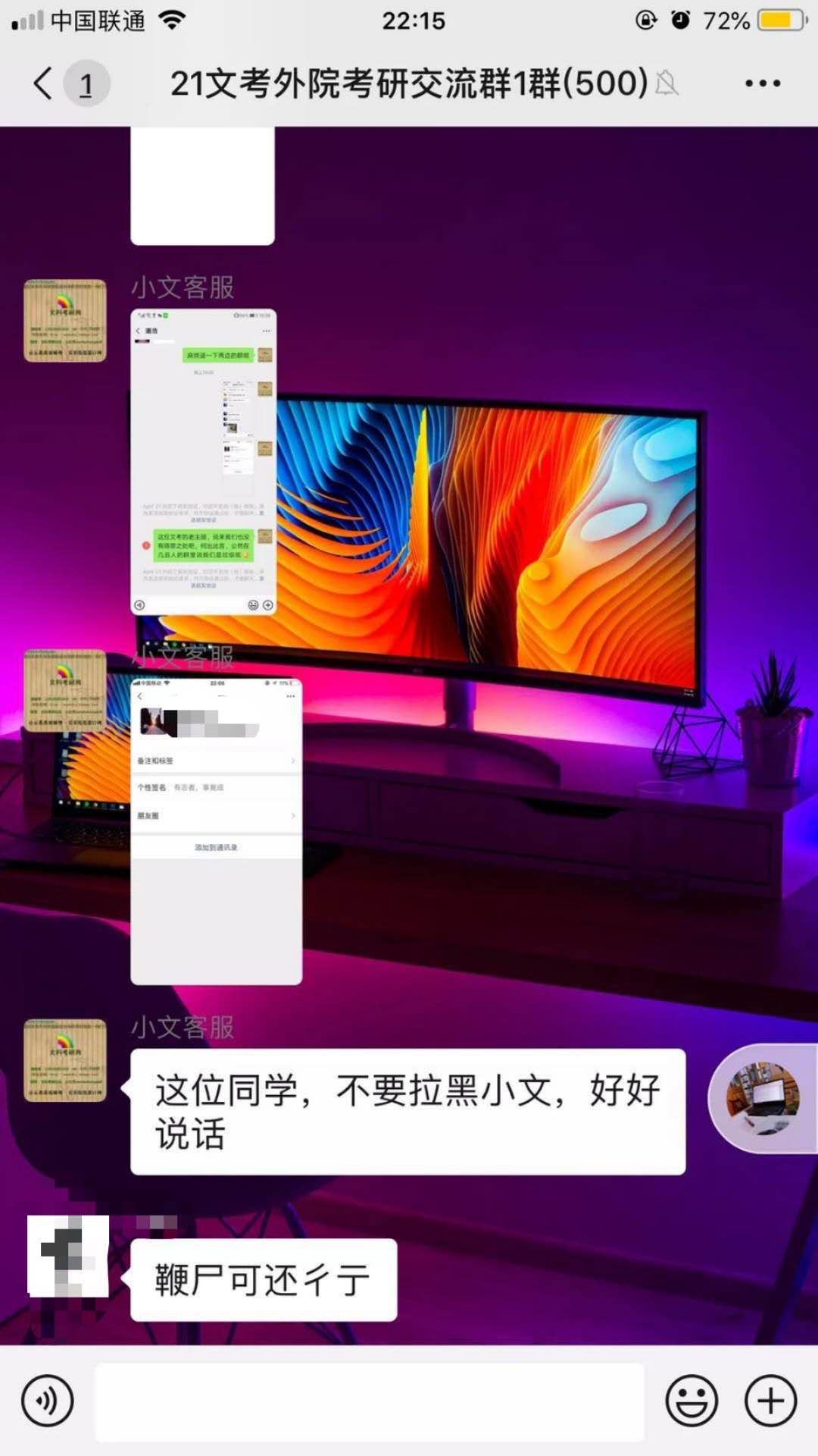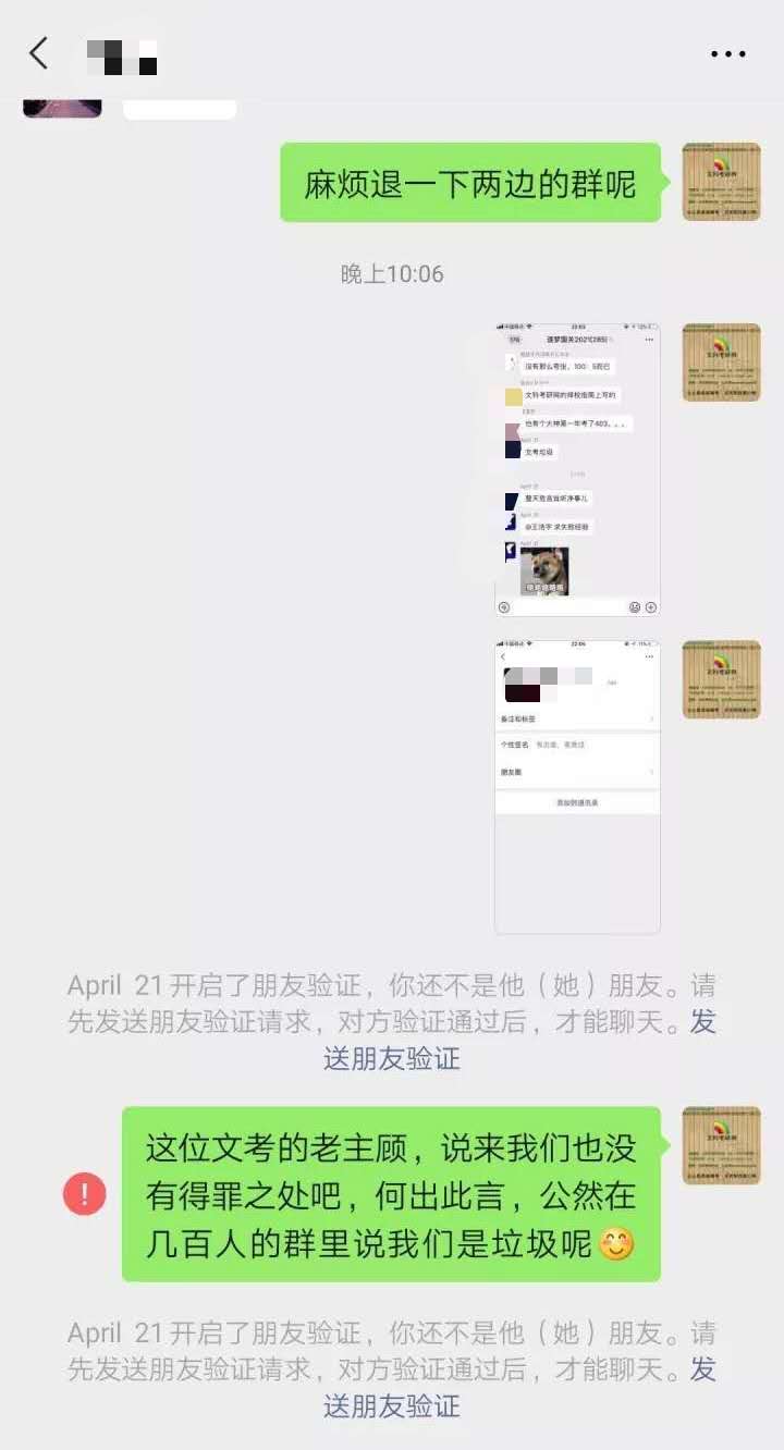 张铭提供的几张微信聊天截图显示,疑因一位文考网“老主顾”在群众说了一句“文考垃圾”,便被一位名称为“小文客服”的微信用户,将其微信账号、头像及聊天记录等发在一个500人的考研交流群中。