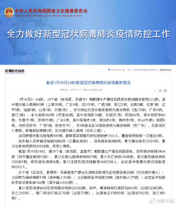 截至1月16日24时,据31个省(自治区、直辖市)和新疆生产建设兵团报告,现有确诊病例3494例(其中重症病例15例),累计治愈出院病例96957例,累计死亡病例4636例,累计报告确诊病例105087例,现有疑似病例8例。累计追踪到密切接触者1483318人,尚在医学观察的密切接触者56362人。