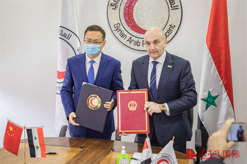 | 2022年1月16日,中国政府向叙利亚紧急粮食援助交接仪式在大马士革举行。中国驻叙利亚大使冯飚与叙利亚红新月会主席哈立德共同签署了交接证书。人民网记者 薛丹摄 |