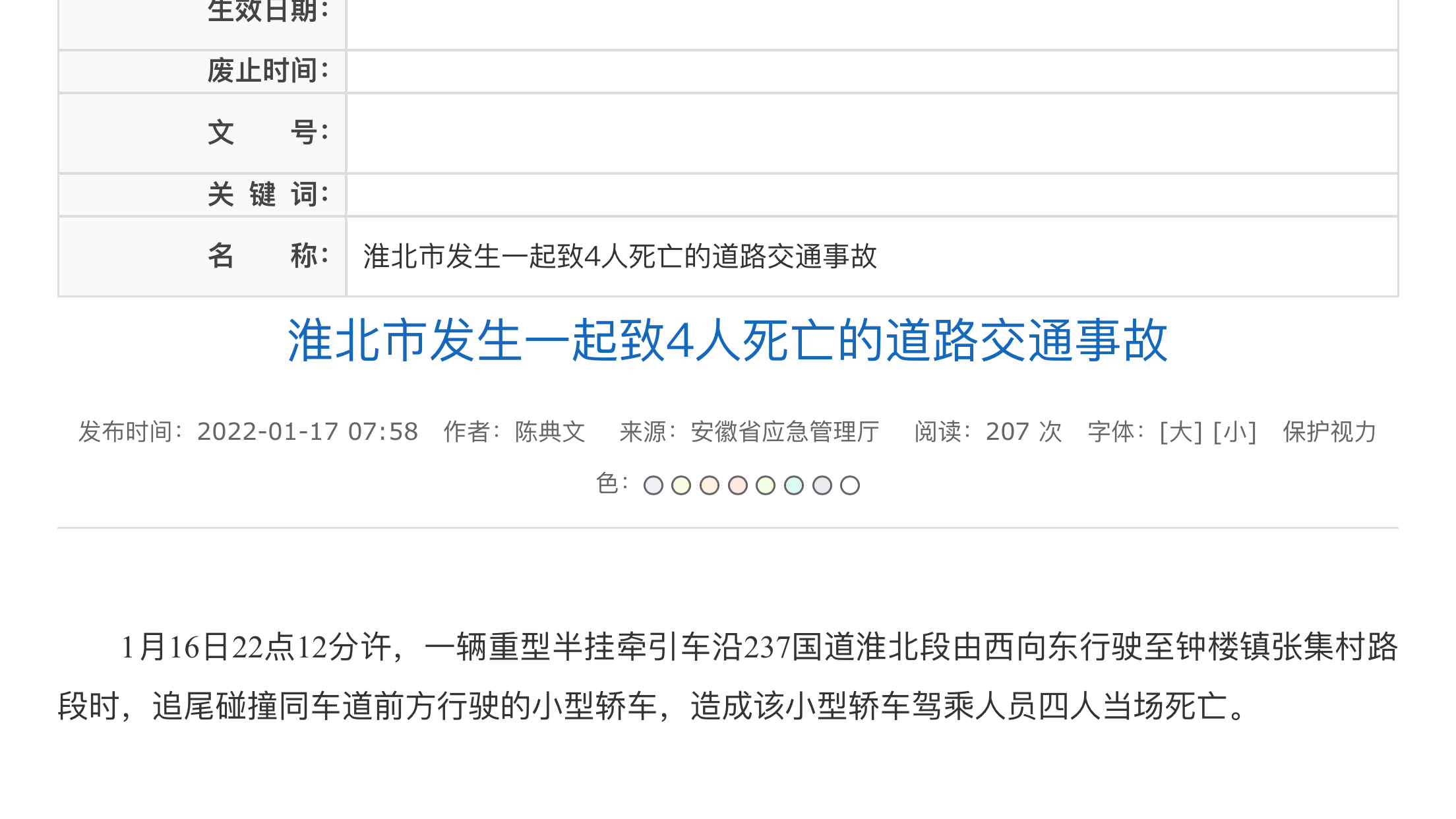 根据安徽省应急管理厅网站17日发布的消息,1月16日22时12分许,一辆重型半挂牵引车沿237国道淮北段由西向东行驶至钟楼镇张集村路段时,追尾碰撞同车道前方行驶的小型轿车,造成该小型轿车驾乘人员4人当场死亡。