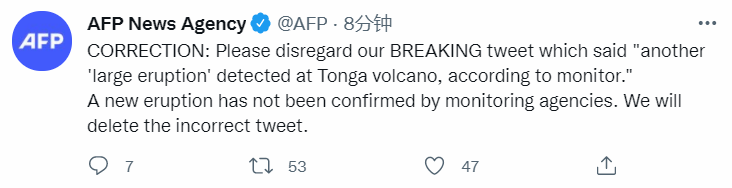 法新社澄清:汤加海底火山再次大喷发未获得监测机构确认