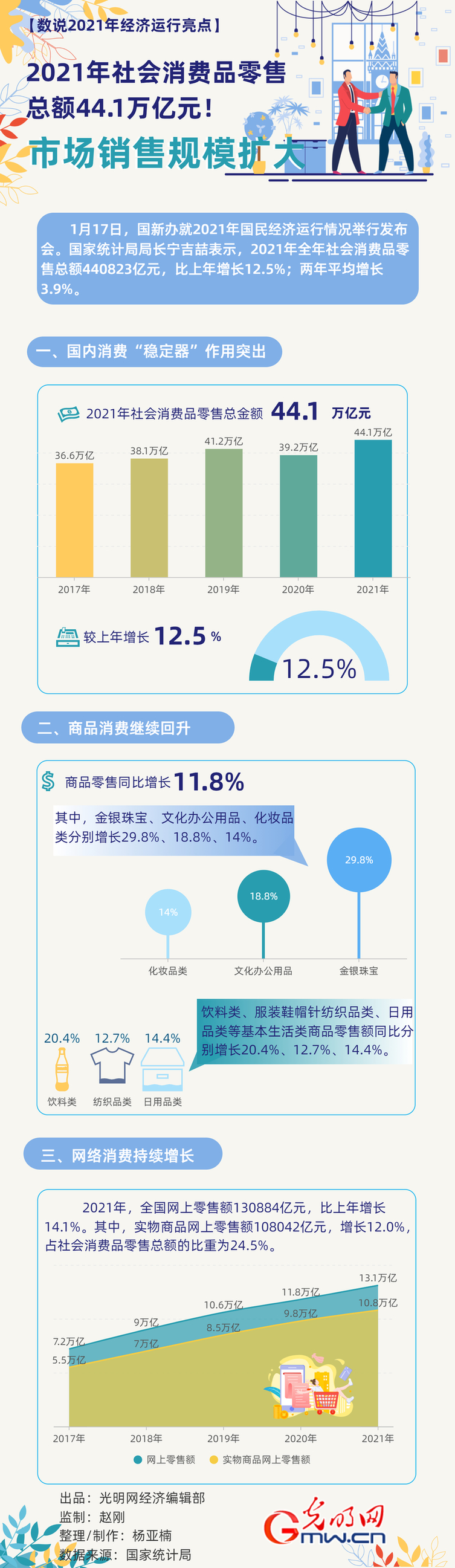 光明网讯(记者 杨亚楠)1月17日,国新办就2021年国民经济运行情况举行发布会。国家统计局局长宁吉喆表示,2021年全年社会消费品零售总额440823亿元,比上年增长12.5%;两年平均增长3.9%。