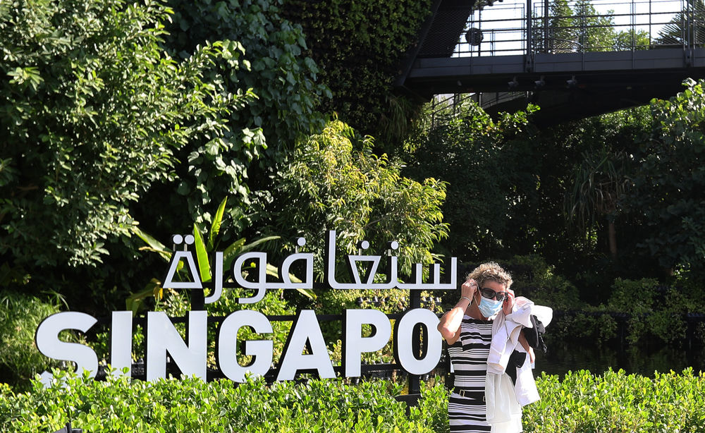 1月11日,游客在阿拉伯联合酋长国迪拜世博会的新加坡馆前拍照。新华社记者 王东震 摄
