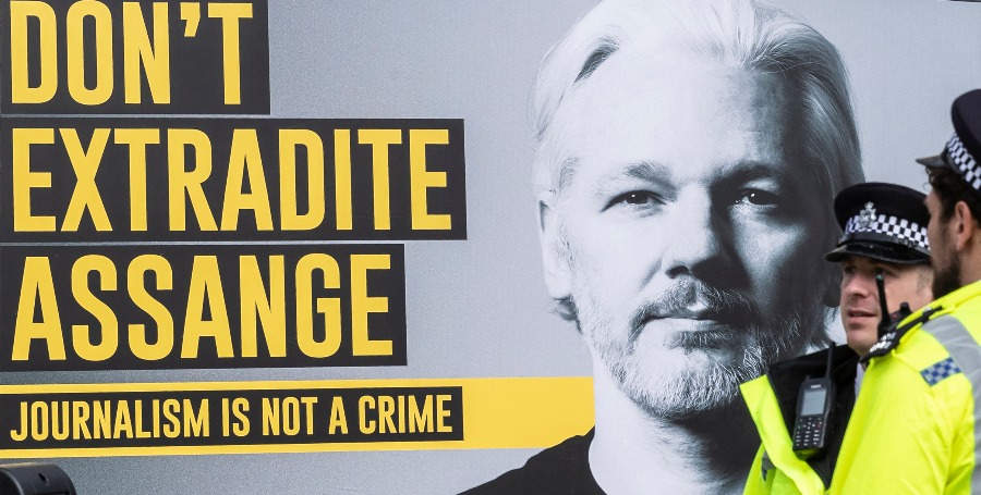 这张2020年9月8日拍摄的资料照片显示,在英国伦敦议会大厦外,一辆写有“不要引渡阿桑奇”标语的汽车从两名警察身旁驶过。(新华社记者韩岩摄)
