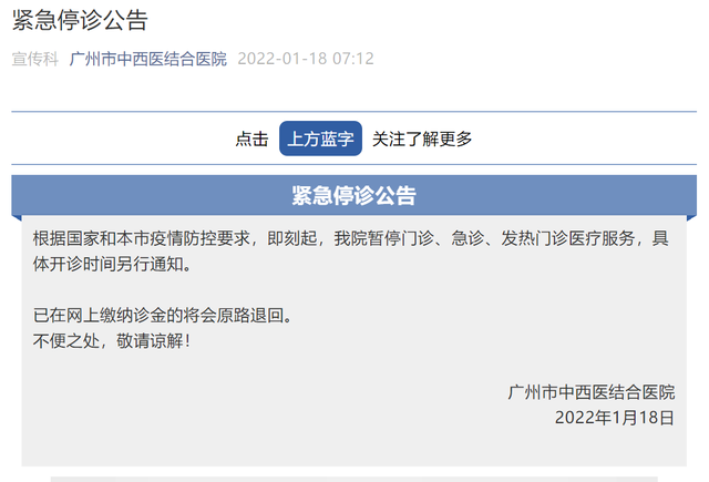 1月18日,广州市中西医结合医院在其微信公众号上发布紧急停诊公告称,根据国家和本市疫情防控要求,即刻起,该院暂停门诊、急诊、发热门诊医疗服务,具体开诊时间另行通知。已在网上缴纳诊金的将会原路退回。不便之处,敬请谅解!