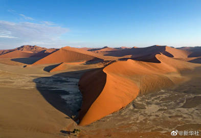 #你见过红色的沙漠吗#【#纳米比亚红沙漠真奇特#】在纳米比亚的纳米布-诺克卢福国家公园内有一处名为索萨斯雷的沙漠,因沙中铁元素含量高而在阳光下呈现红色。索萨斯雷红沙漠附近还有一处盐沼地,一棵棵枯木树立其中,形成奇特的景观。