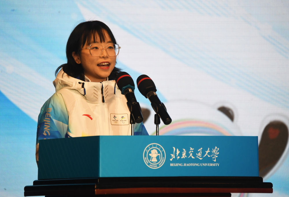↑志愿者代表方舟在北京交通大学2022年冬奥会和冬残奥会志愿者出征动员大会上发言。