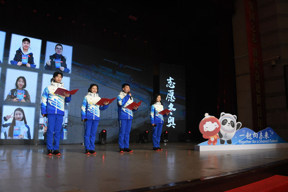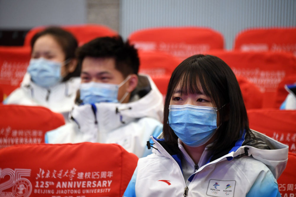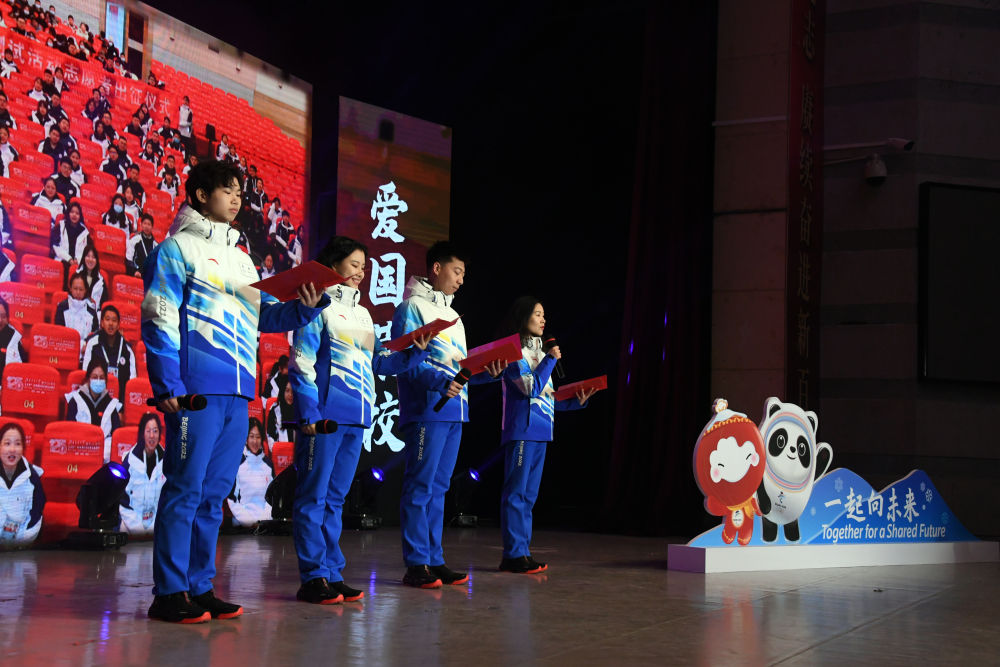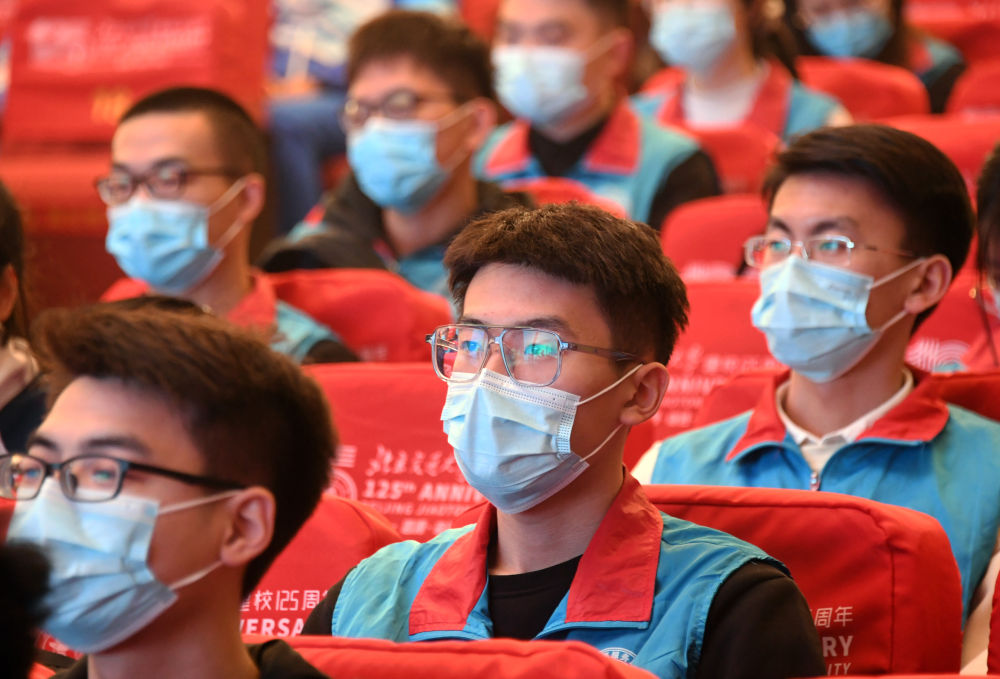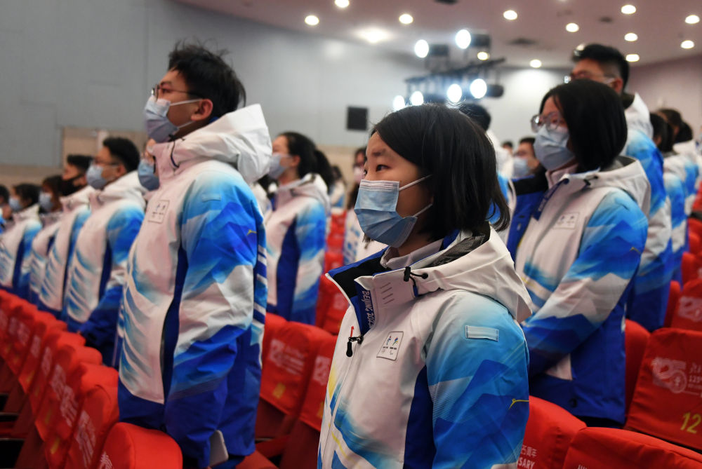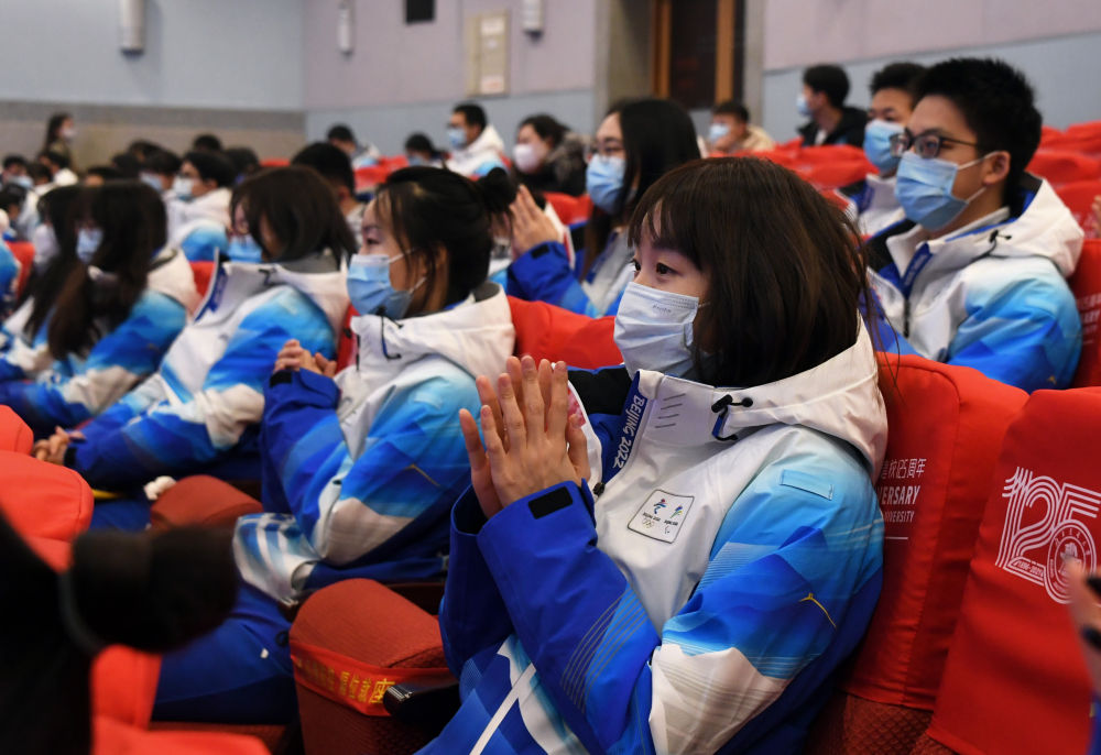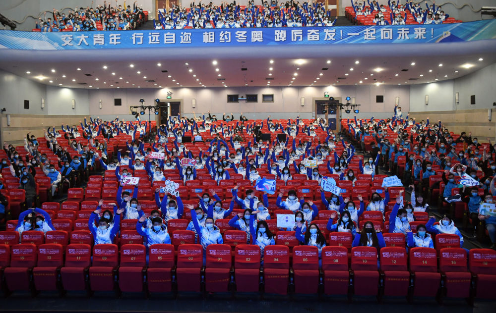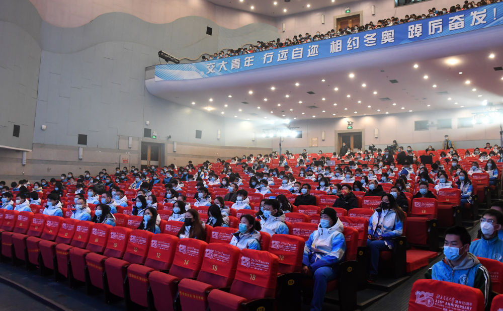 ↑志愿者参加北京交通大学2022年冬奥会和冬残奥会志愿者出征动员大会。