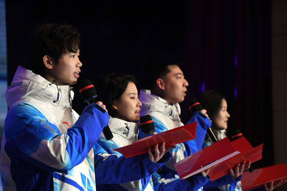 ↑志愿者在北京交通大学2022年冬奥会和冬残奥会志愿者出征动员大会上宣誓。