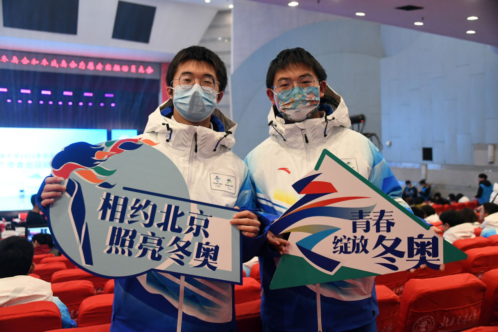 ↑两名志愿者在在北京交通大学2022年冬奥会和冬残奥会志愿者出征动员大会上展示标语。