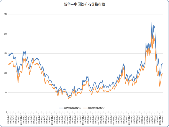 新华财经北京1月18日电(郑豪)新华-中国铁矿石价格指数显示,1月11日至1月17日间,进口铁矿石价格偏弱运行。数据显示,1月17日,我国62%品位进口铁矿石价格指数为124,较1月10日下跌0.80%;58%品位进口铁矿石价格指数为99,较1月10日持平。