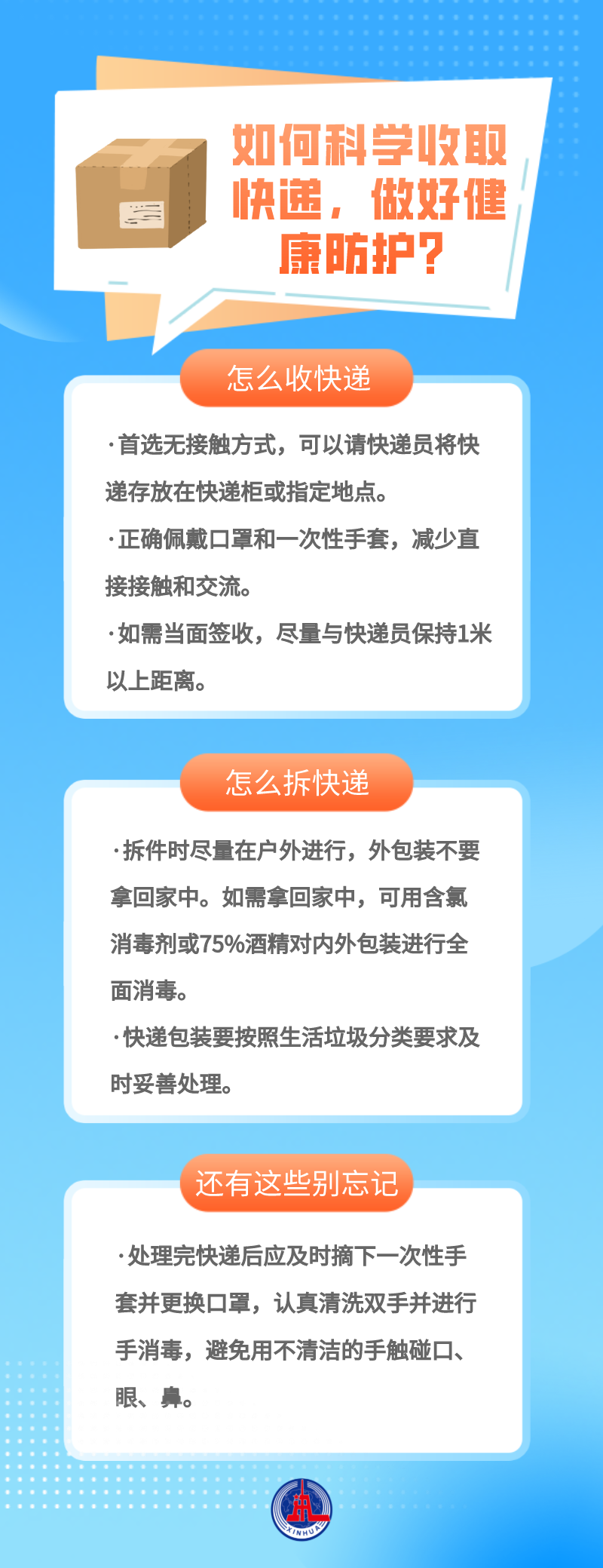此外,拆件时尽量在户外进行,外包装不必拿回家中,可按照生活垃圾分类处理;如需拿回家中,可用含氯消毒剂或75%酒精对内外包装进行全面消毒。处理完邮件后及时摘下手套,更换口罩,认真进行手消毒或清洗双手,避免用不清洁的手触碰口、眼、鼻。