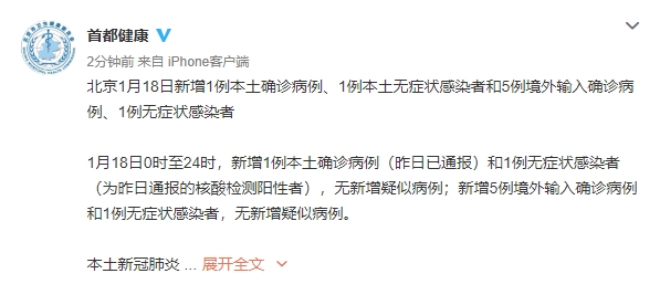 北京1月18日新增1例本土确诊病例、1例本土无症状感染者和5例境外输入确诊病例、1例无症状感染者