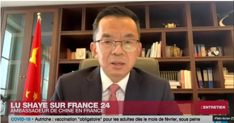 | 中国驻法大使卢沙野接受法兰西24电视台采访。视频截图 |