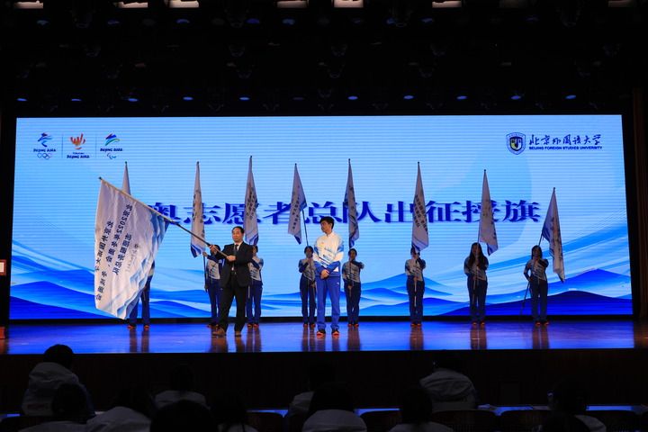 北京外国语大学党委书记王定华在现场向学校冬奥志愿者总队授旗,标志着北外冬奥志愿者工作进入赛时状态。王定华勉励他们在志愿服务岗位上彰显青年风采,讲好中国故事,传播中国声音,握紧百年接力棒,谱写冰雪新华章。