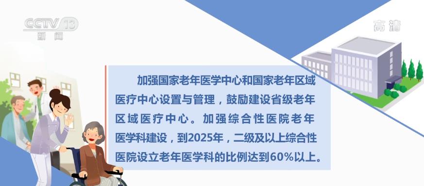 同时,要加强国家老年医学中心和国家老年区域医疗中心设置与管理,鼓励建设省级老年区域医疗中心。加强综合性医院老年医学科建设,到2025年,二级及以上综合性医院设立老年医学科的比例达到60%以上。