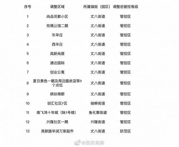 据@西安高新 19日消息,按照国务院联防联控机制和省、市关于新冠肺炎疫情社区防控工作要求,结合西安高新区疫情防控形势,经高新区新冠肺炎疫情防控指挥部同意,决定自2022年1月19日起,将丈八街道尚品花都小区等4个街道的13个城市小区(含1家大型商超)防控区域进行调整,其中12个由封控区调整为管控区,1个大型商超由封控区调整为防范区(具体名单见下表)。其他区域管控措施不变。