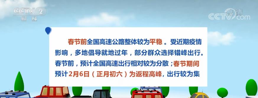 春节前,全国高速公路整体较为平稳。受近期疫情影响,多地倡导就地过年,部分群众选择错峰出行。春节前,预计全国高速出行相对较为分散;春节期间,预计2月6日(正月初六)为返程高峰,出行较为集中,拥堵高峰时段为14点—19点;春节后,预计元宵节后2月16日(正月十六)会出现一波返程小高峰。