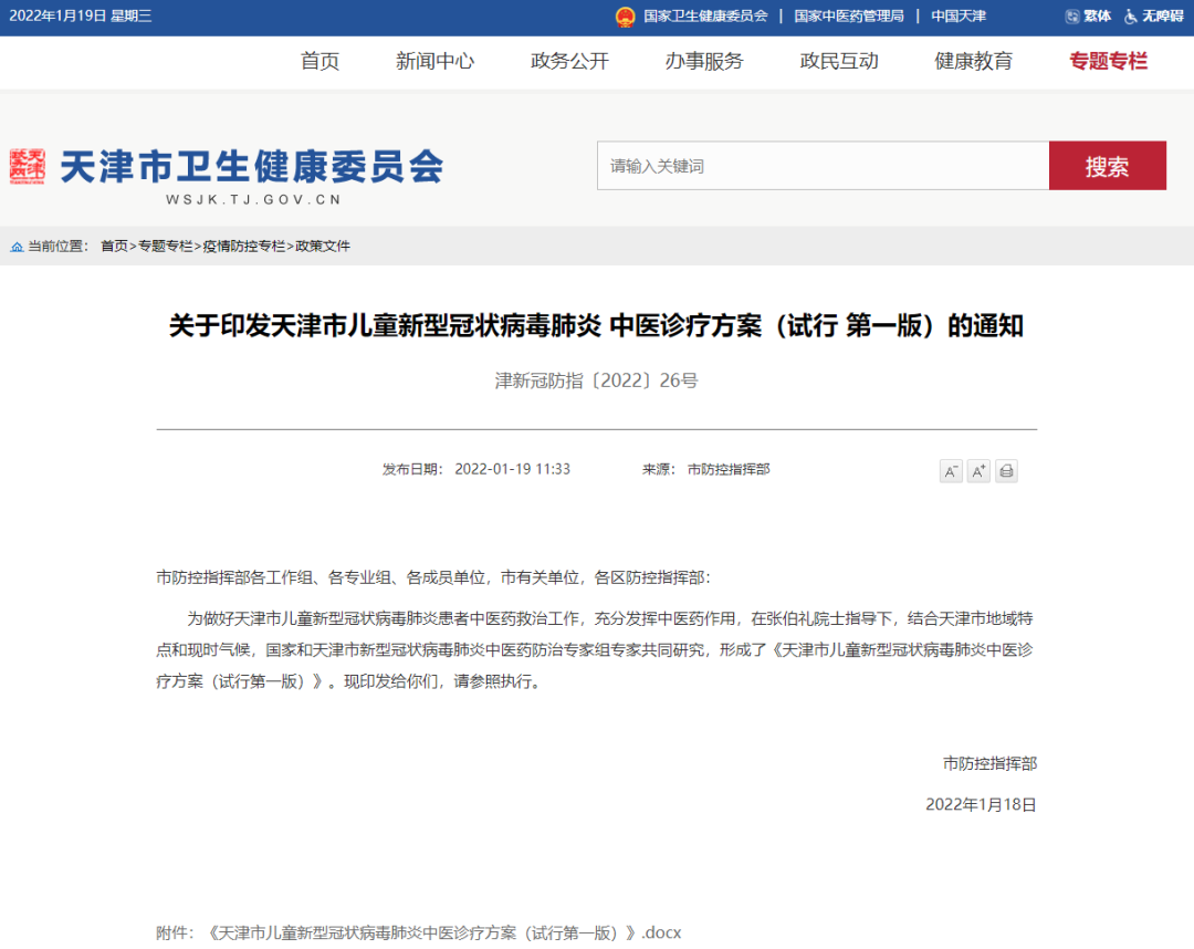 为做好天津市儿童新型冠状病毒肺炎患者中医药救治工作,充分发挥中医药作用,在张伯礼院士指导下,结合天津市地域特点和现时气候,国家和天津市新型冠状病毒肺炎中医药防治专家组专家共同研究,形成了《天津市儿童新型冠状病毒肺炎中医诊疗方案(试行第一版)》。现印发给你们,请参照执行。