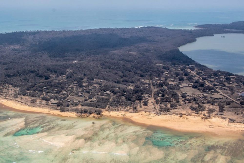这张新西兰国防部提供的照片显示的是1月17日拍摄的汤加主岛汤加塔布岛。(新华社发,新西兰国防部供图)