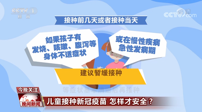 专家表示,接种前几天或者接种当天,如果孩子有发烧、咳嗽、腹泻等身体不适症状,或在慢性疾病急性发病期,建议暂缓接种,等症状基本消退后再接种。食物过敏的儿童,如果正好处于过敏的急性反应期,或接种部位皮肤出现湿疹、特应性皮炎等,应暂缓接种;如果没有这些过敏症状,可以正常接种所有疫苗。另外新冠疫苗暂不推荐与其他疫苗同时接种。