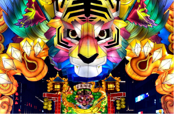 济南市槐荫区印象济南·泉世界的虎年生肖花灯点靓泉城济南夜生活,营造浓浓的节日气氛。