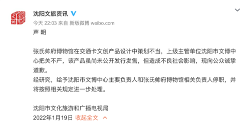 ·推张作霖“大帅币”交通卡引争议,沈阳文旅局致歉:负责人停职。